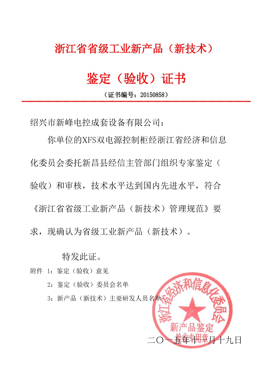 XFS雙電源控制柜 20150858-新產(chǎn)品科技證書(shū)