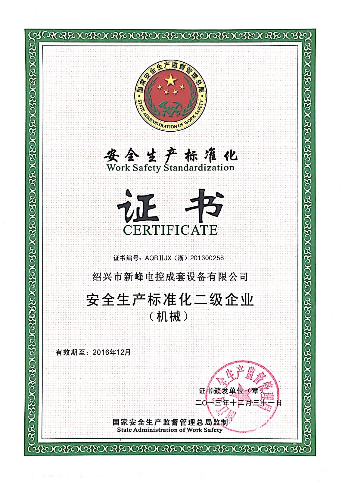 安全生產(chǎn)標(biāo)準(zhǔn)化二級-企業(yè)榮譽證書